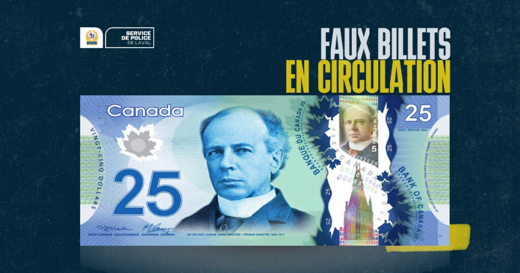 Anyone with information regarding the circulation of counterfeit currency is encouraged to confidentially contact the Laval Police on their Information Line at 450-662-INFO (4636) or by calling 911.